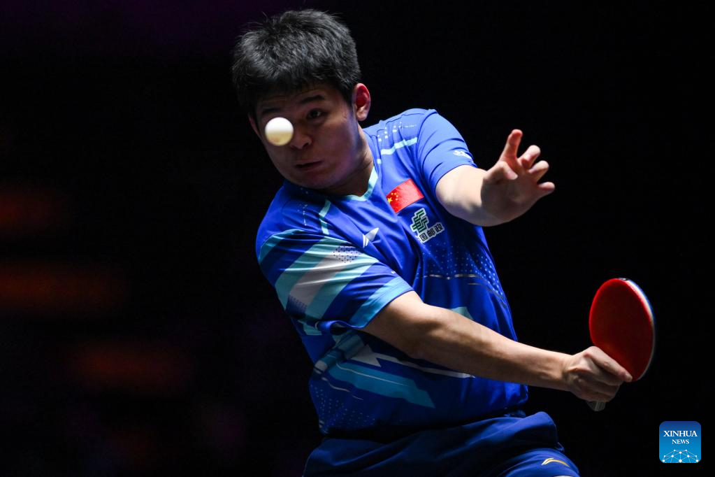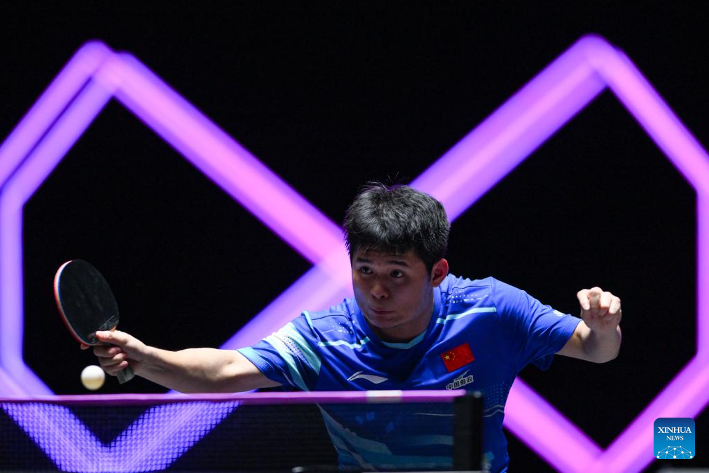 Lin Shidong of China competes during the men's singles quarterfinal match against Anders Lind of Denmark at the 2025 World Table Tennis (WTT) Champions Macao in Macao, south China, Sept. 13, 2025. (Xinhua/Cheong Kam Ka)