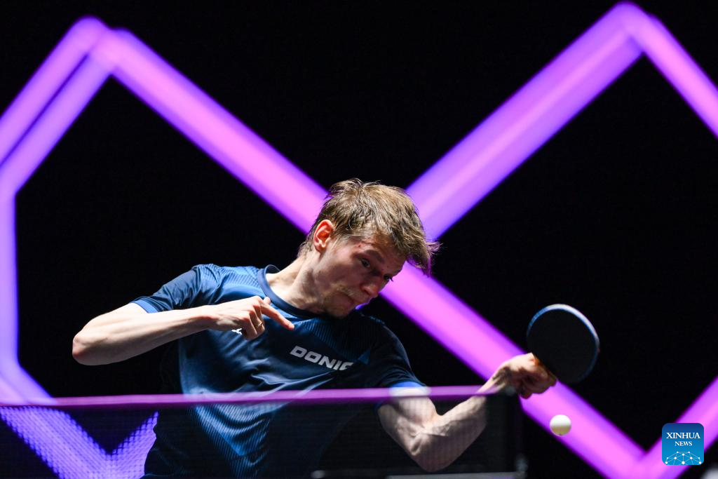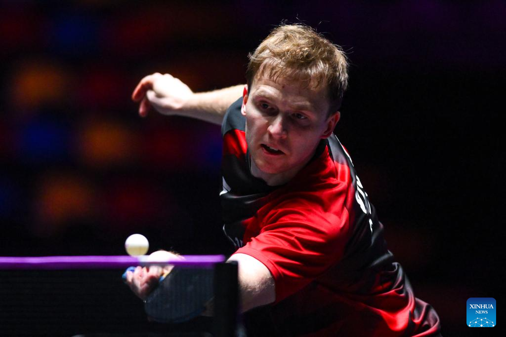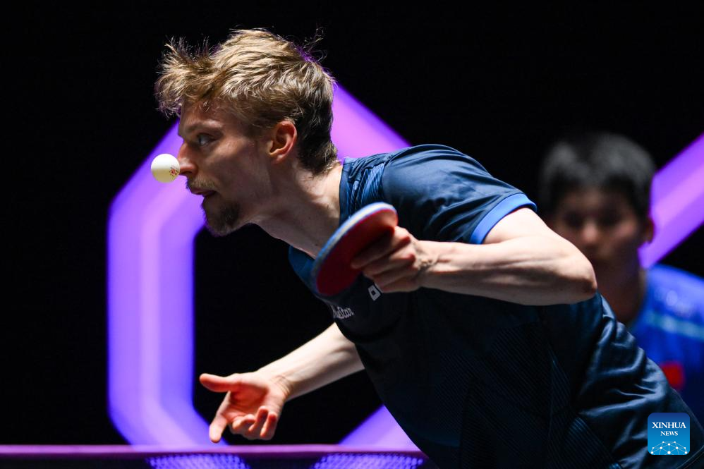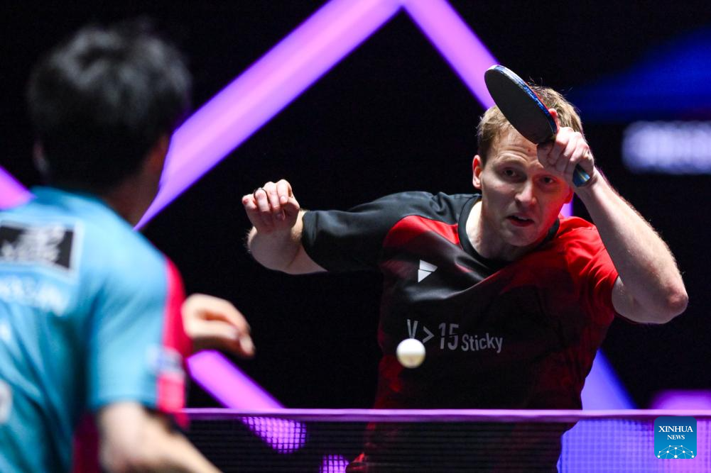Benedikt Duda of Germany hits a return during the men's singles quarterfinal match against Jang Woojin of South Korea at the 2025 World Table Tennis (WTT) Champions Macao in Macao, south China, Sept. 13, 2025. (Xinhua/Cheong Kam Ka)