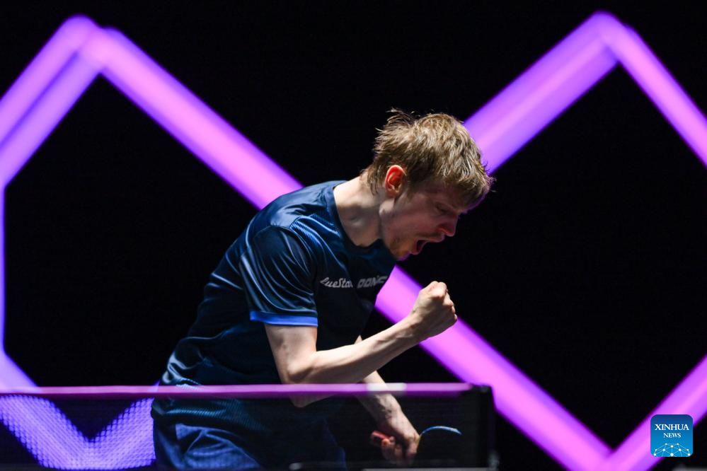 Anders Lind of Denmark celebrates scoring during the men's singles quarterfinal match against Lin Shidong of China at the 2025 World Table Tennis (WTT) Champions Macao in Macao, south China, Sept. 13, 2025. (Xinhua/Cheong Kam Ka)