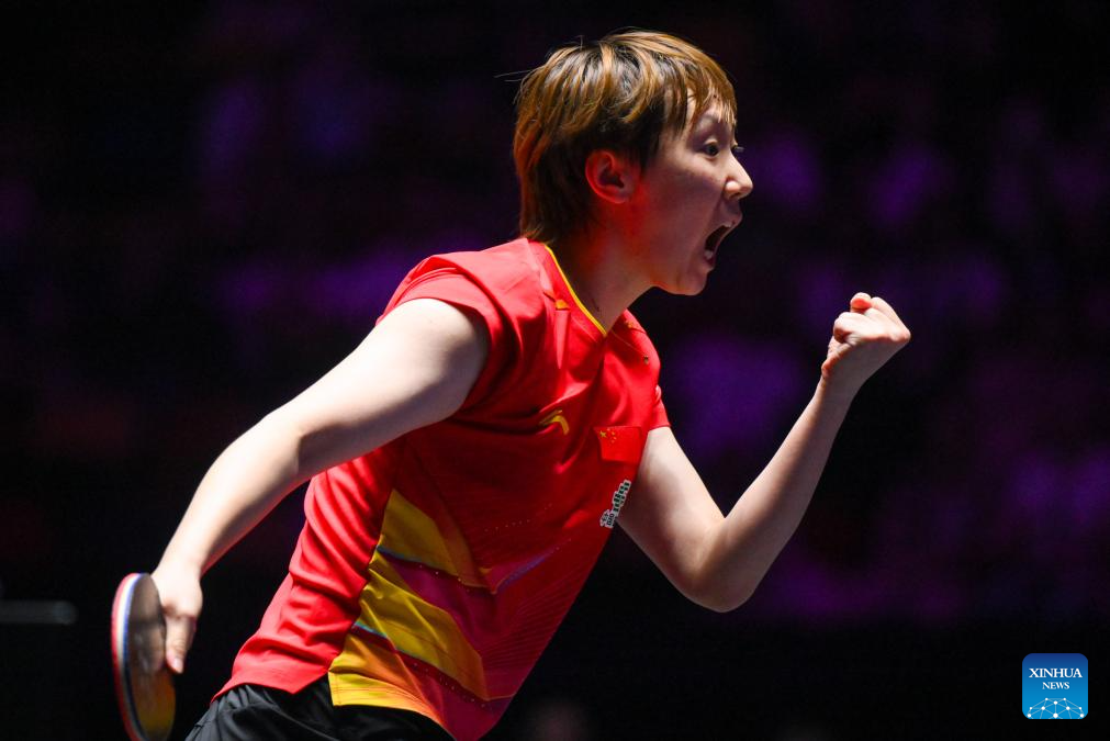 Wang Manyu of China celebrates scoring during the women's singles quarterfinal match against Zhu Yuling of China's Macao at the 2025 World Table Tennis (WTT) Champions Macao in Macao, south China, Sept. 13, 2025. (Xinhua/Cheong Kam Ka)