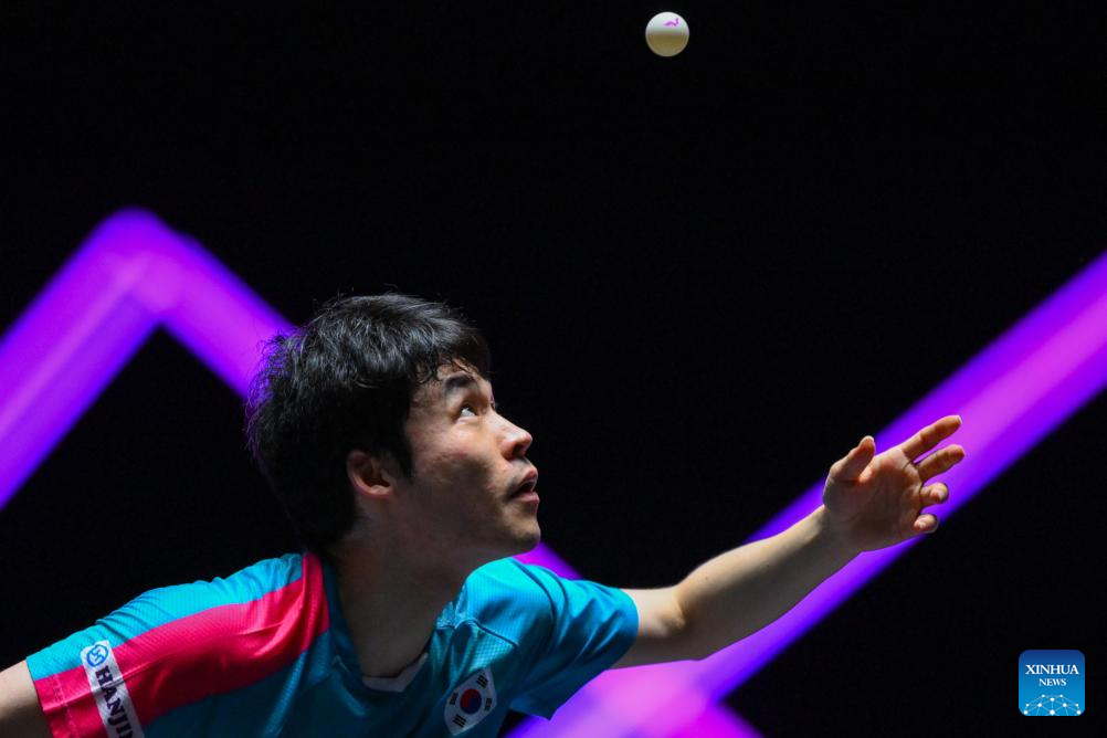 Jang Woojin of South Korea serves during the men's singles quarterfinal match against Benedikt Duda of Germany at the 2025 World Table Tennis (WTT) Champions Macao in Macao, south China, Sept. 13, 2025. (Xinhua/Cheong Kam Ka)