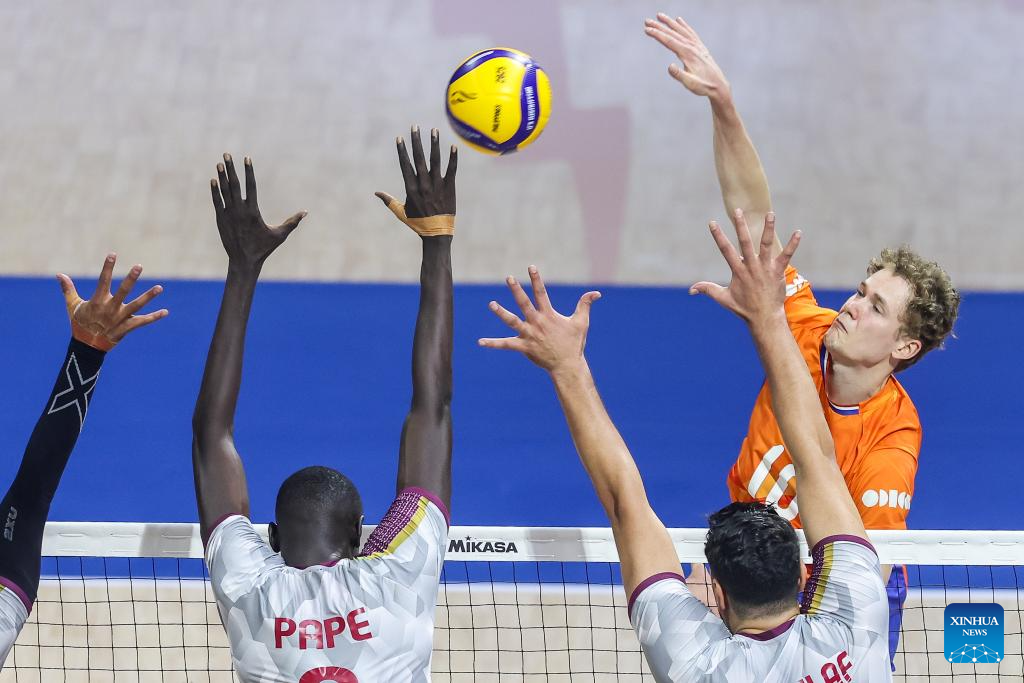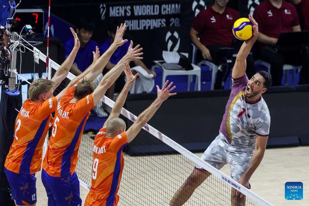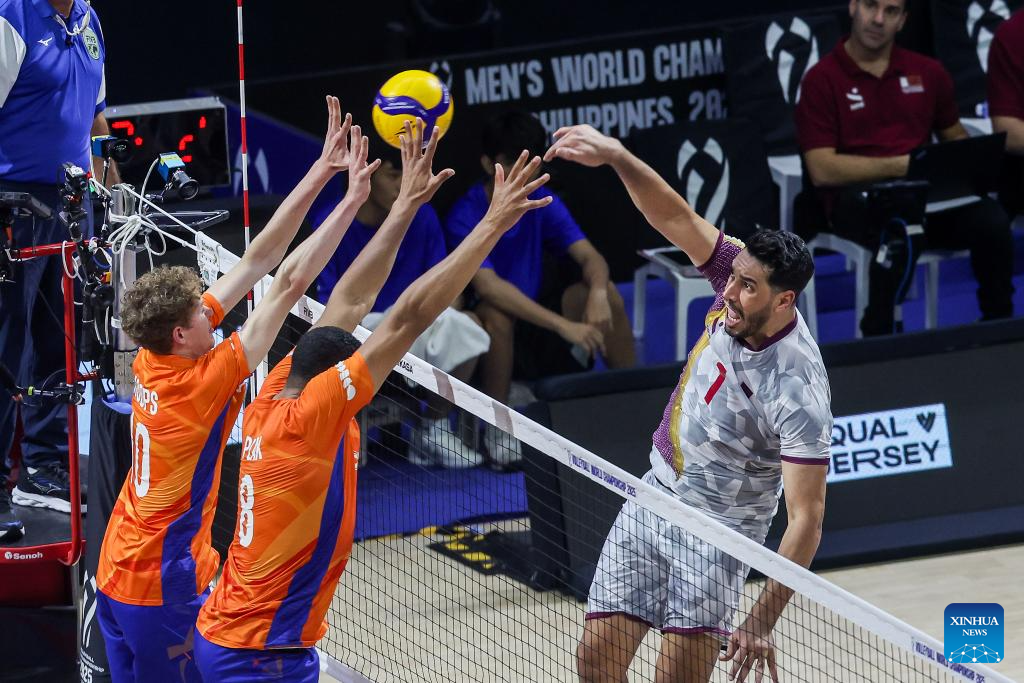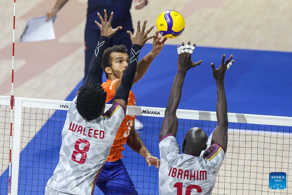 Youssef Oughlaf (1st R) of Qatar competes during the Pool B match between the Netherlands and Qatar at the 2025 FIVB Volleyball Men's World Championship in Quezon City, the Philippines, Sept. 13, 2025. (Xinhua/Rouelle Umali)