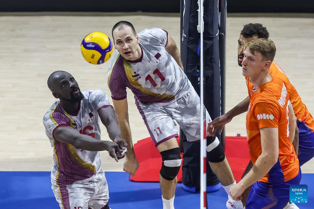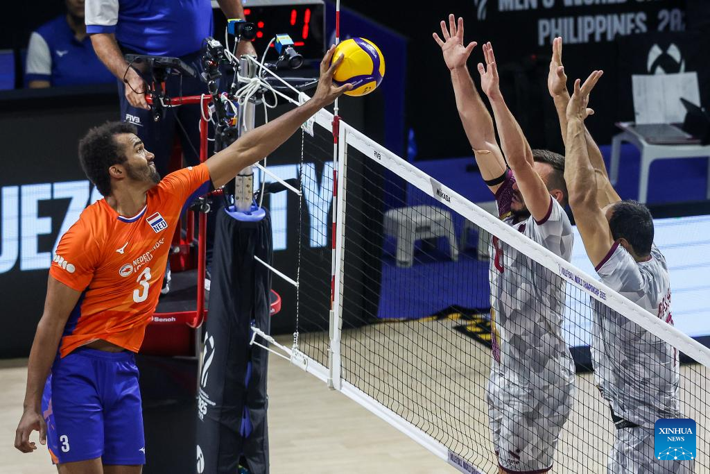 Michiel Ahyi (L) of the Netherlands competes during the Pool B match between the Netherlands and Qatar at the 2025 FIVB Volleyball Men's World Championship in Quezon City, the Philippines, Sept. 13, 2025. (Xinhua/Rouelle Umali)