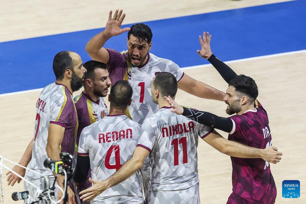 Players of Qatar celebrate scoring during the Pool B match between the Netherlands and Qatar at the 2025 FIVB Volleyball Men's World Championship in Quezon City, the Philippines, Sept. 13, 2025. (Xinhua/Rouelle Umali)