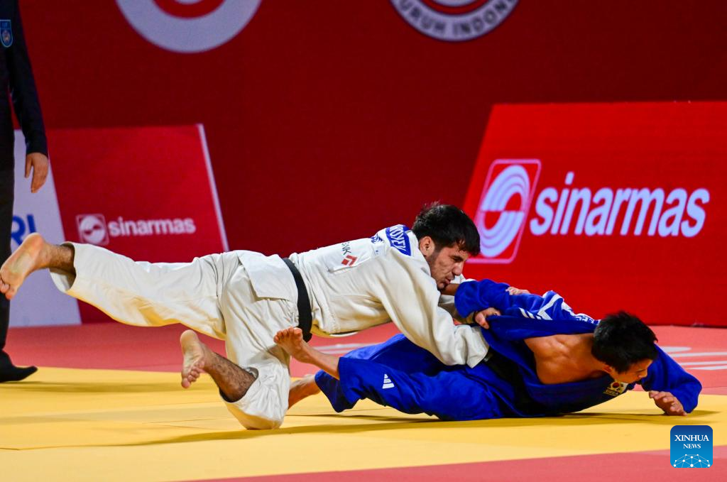 Dilshodbek Hamroyev (L) of Uzbekistan competes against Lee Joonhyun of South Korea during the men's -66kg final at the Asian Junior Judo Championships 2025 in Jakarta, Indonesia, Sept. 13, 2025. (Xinhua/Zulkarnain)