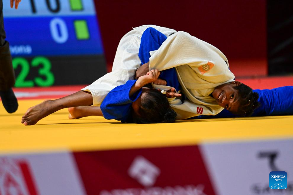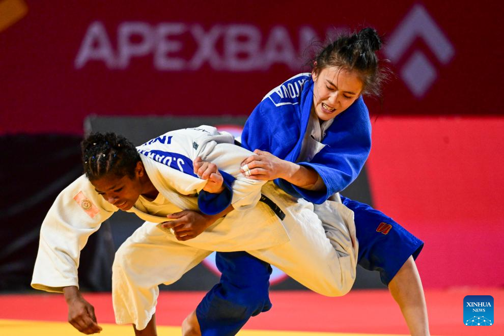 Darjada Shahin Rajakbhai (L) of India competes against Raykhona Mamatova of Uzbekistan during the women's -57kg final at the Asian Junior Judo Championships 2025 in Jakarta, Indonesia, Sept. 13, 2025. (Xinhua/Zulkarnain)
