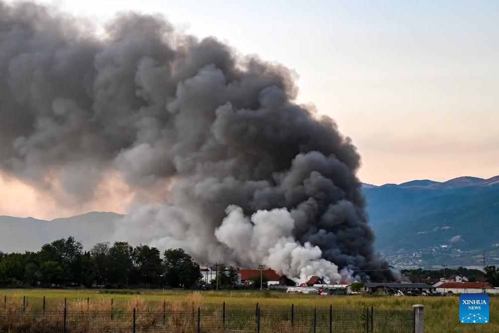 Black smoke rises from a huge fire at a "Zero Waste Skopje" facility for plastic materials in Skopje, North Macedonia, on Sept. 13, 2025. (Photo by Tomislav Georgiev/Xinhua)