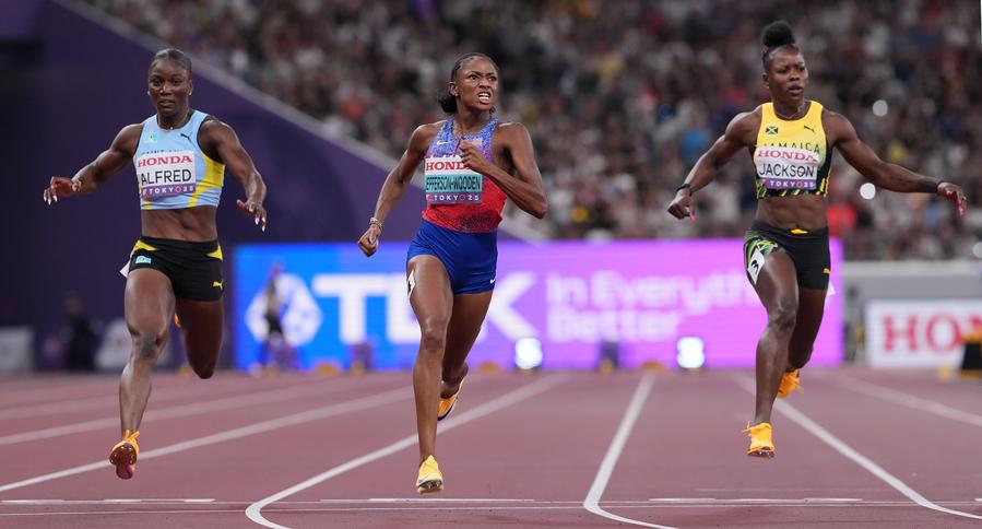 TOKYO, Sept. 14 (Xinhua) -- American Melissa Jefferson-Wooden claimed the title of the women's 100 meters at the World Athletics Championships here on Sunday.