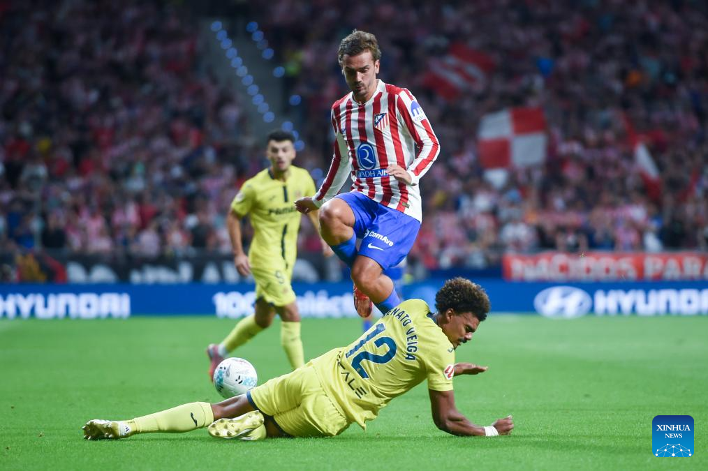 Antoine Griezmann (top) of Atletico de Madrid vies with Renato Veiga of Villarreal during the La Liga football match between Atletico de Madrid and Villarreal CF in Madrid, Spain, on Sept. 13, 2025. (Photo by Gustavo Valiente/Xinhua)