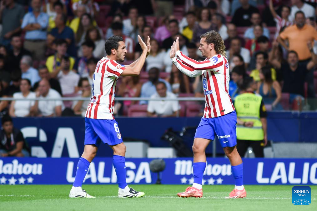 Koke (L) and Antoine Griezmann of Atletico de Madrid celebrate a goal by teammate Pablo Barrios during the La Liga football match between Atletico de Madrid and Villarreal CF in Madrid, Spain, on Sept. 13, 2025. (Photo by Gustavo Valiente/Xinhua)