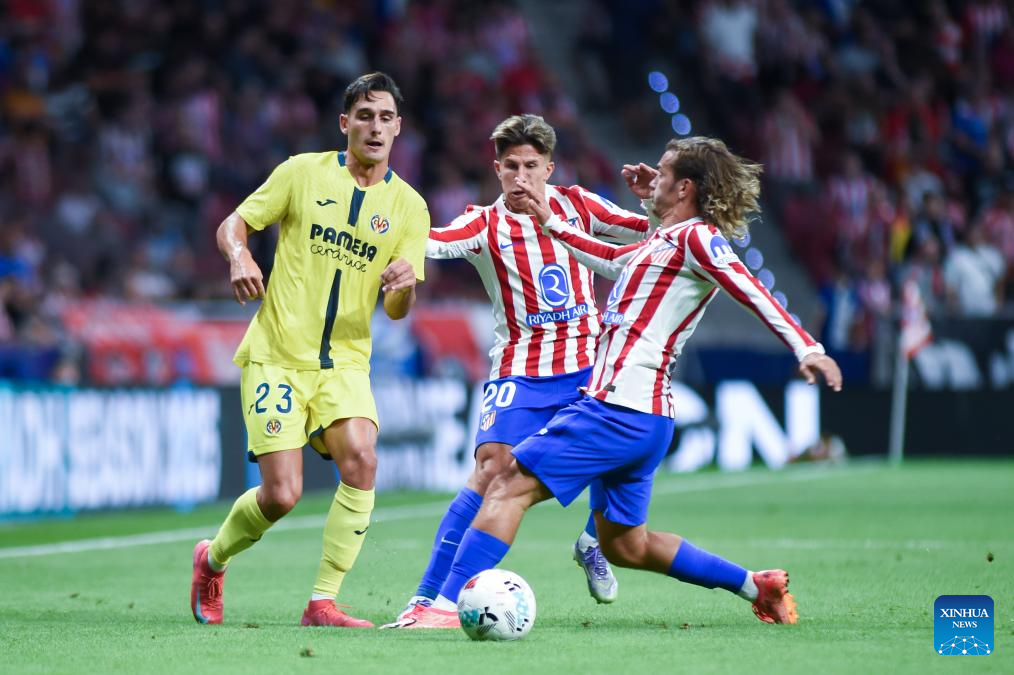 Giuliano Simeone (C) and Antoine Griezmann (R) of Atletico de Madrid vie with Sergi Cardona of Villarreal CF during the La Liga football match between Atletico de Madrid and Villarreal CF in Madrid, Spain, on Sept. 13, 2025. (Photo by Gustavo Valiente/Xinhua)