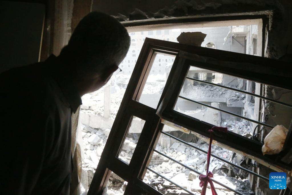 A resident inspects his house after it was damaged by Israeli airstrikes in Sanaa, Yemen, on Sept. 13, 2025. The death toll from Israeli airstrikes on Yemen's Houthi-held capital Sanaa and al-Jawf province on Wednesday has risen to 46, with 165 injured, the Houthi-run health ministry said late Thursday. (Photo by Mohammed Mohammed/Xinhua)
