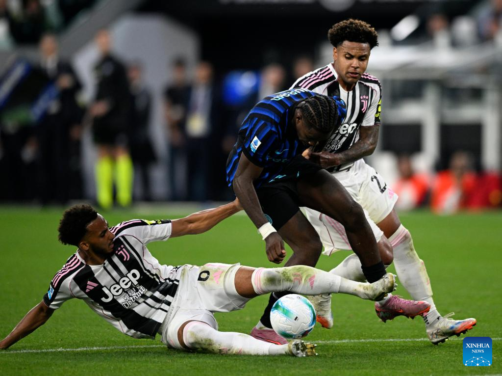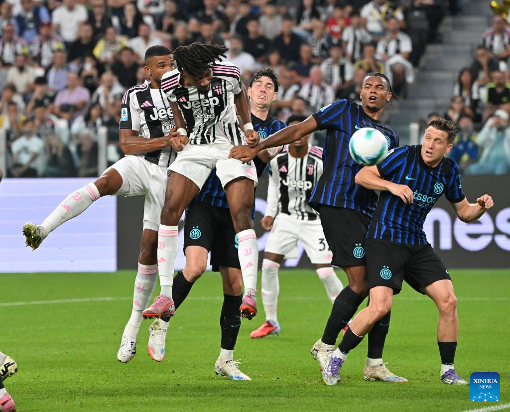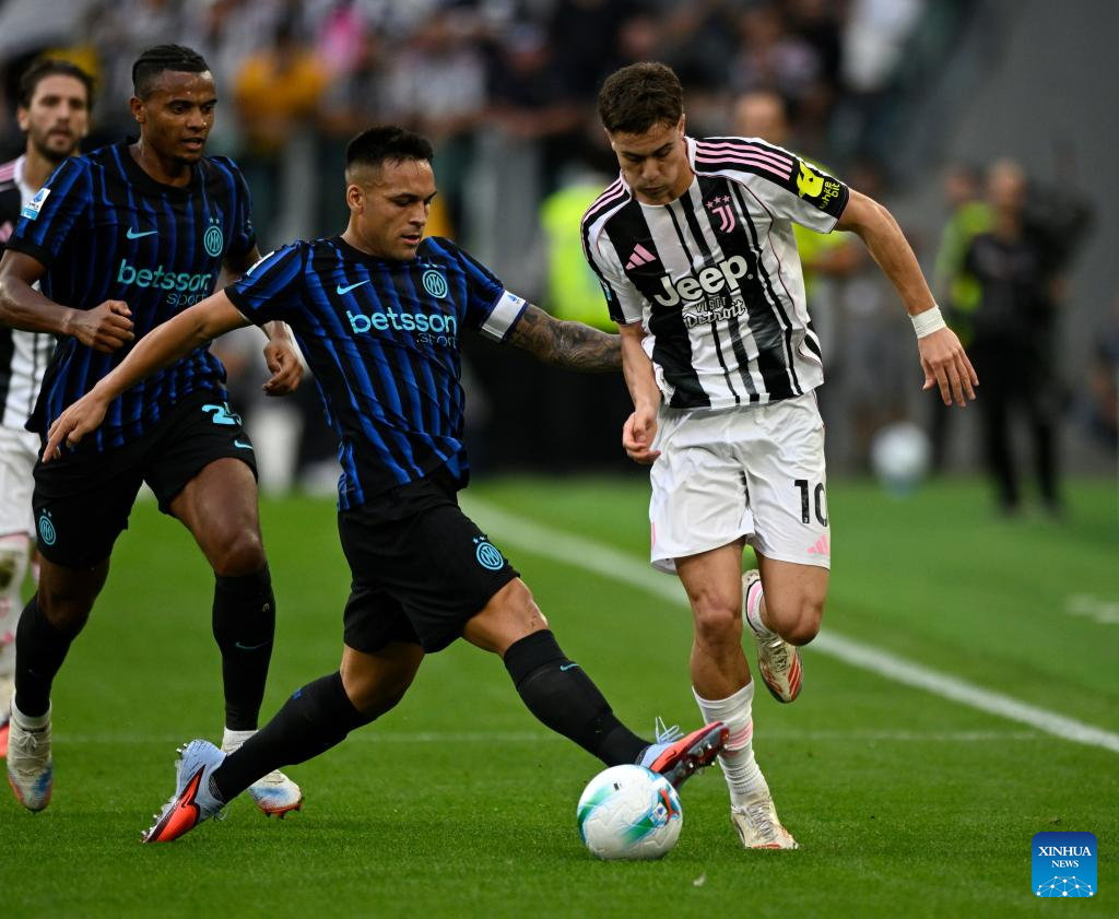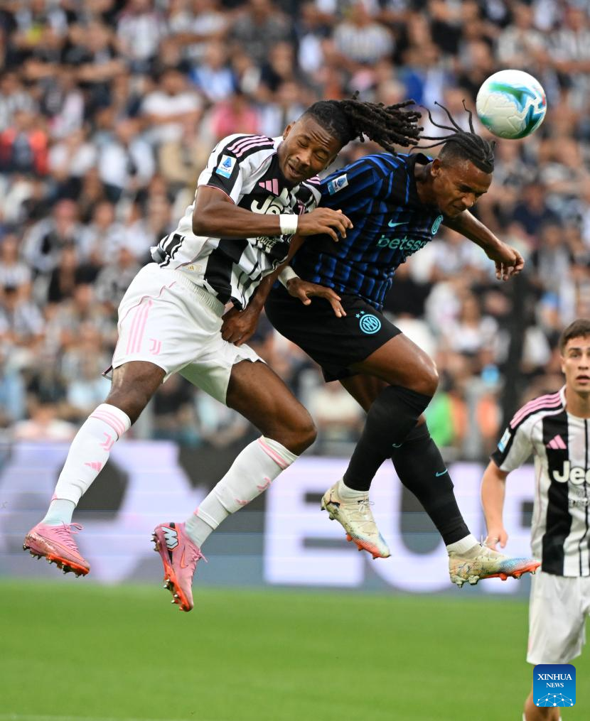 Juventus' Khephren Thuram (L) vies with Inter Milan's Manuel Akanji during a Serie A soccer match between Juventus and Inter Milan in Turin, Italy, Sept. 13, 2025. (Xinhua)