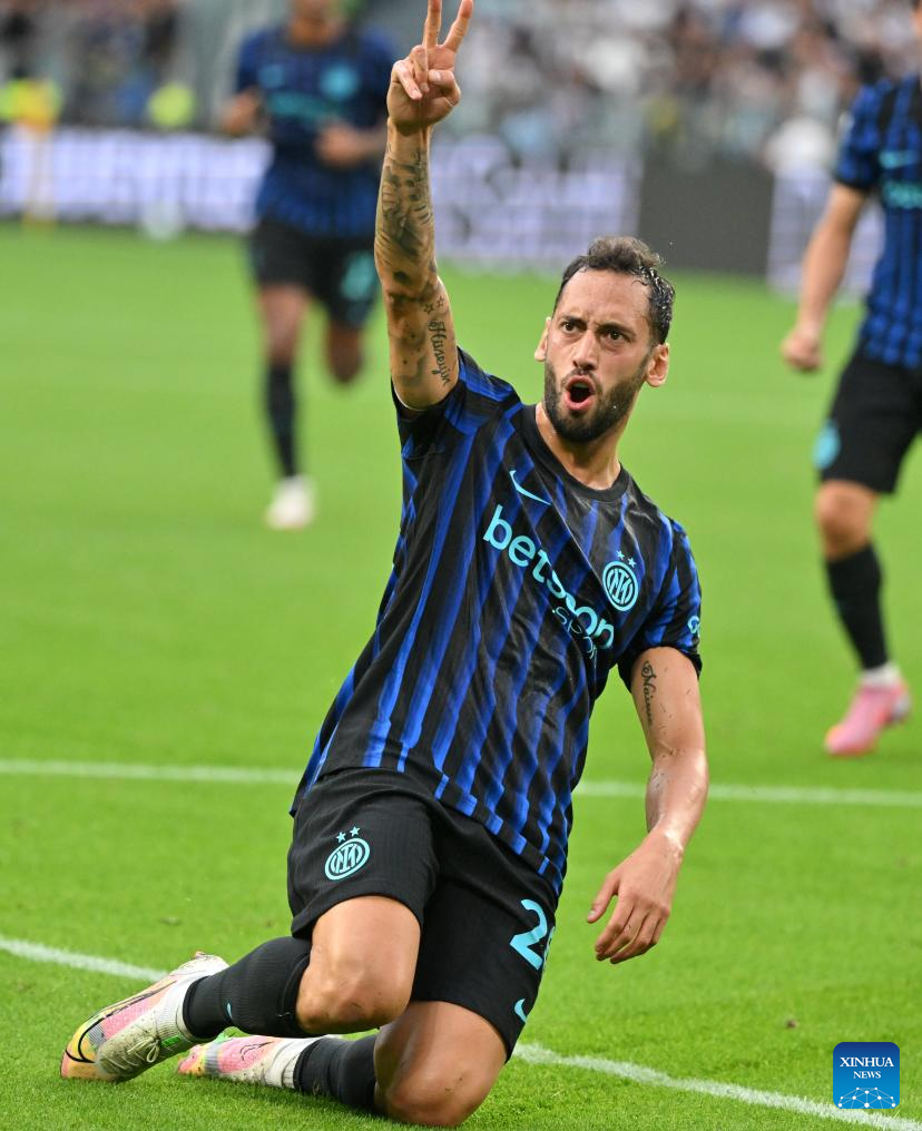 Inter Milan's Hakan Calhanoglu celebrates his goal during a Serie A soccer match between Juventus and Inter Milan in Turin, Italy, Sept. 13, 2025. (Xinhua)