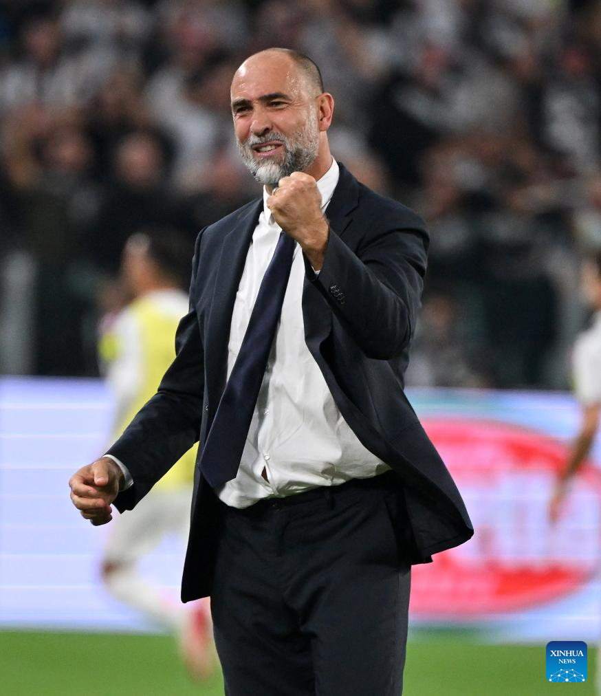 Juventus' head coach Igor Tudor celebrates after Vasilije Azdic's goal during a Serie A soccer match between Juventus and Inter Milan in Turin, Italy, Sept. 13, 2025. (Xinhua)