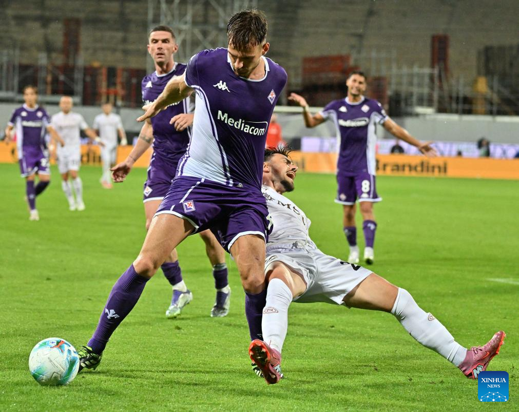 Napoli's Eljif Elmas (R) vies with Fiorentina's Marin Pongracic during a Serie A football match between Fiorentina and Napoli in Florence, Italy, Sept. 13, 2025. (Photo by Augusto Casasoli/Xinhua)