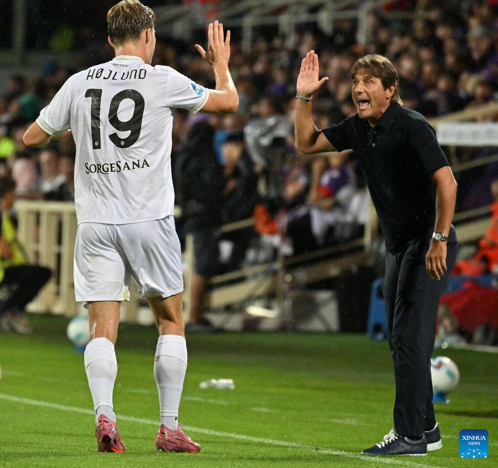 Napoli's Rasmus Hojlund (L) celebrates his goal with head coach Antonio Conte during a Serie A football match between Fiorentina and Napoli in Florence, Italy, Sept. 13, 2025. (Photo by Augusto Casasoli/Xinhua)