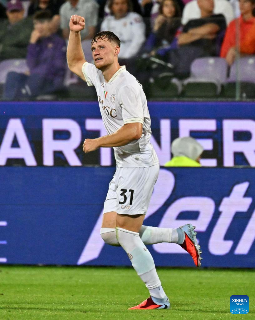 Napoli's Sam Beukema celebrates his goal during a Serie A football match between Fiorentina and Napoli in Florence, Italy, Sept. 13, 2025. (Photo by Augusto Casasoli/Xinhua)