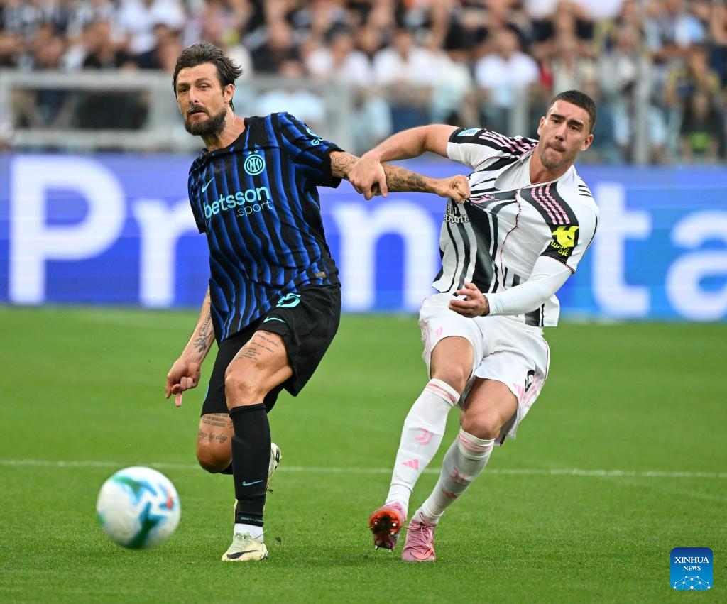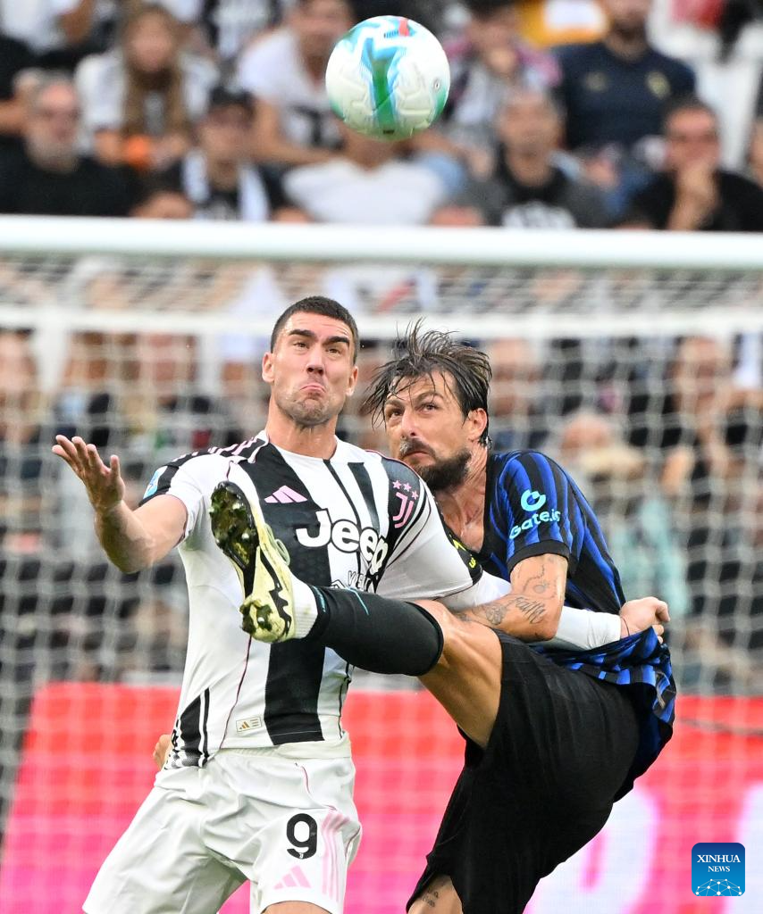 Juventus' Dusan Vlahovic (R) vies with Inter Milan's Francesco Acerbi during a Serie A soccer match between Juventus and Inter Milan in Turin, Italy, Sept. 13, 2025. (Xinhua)