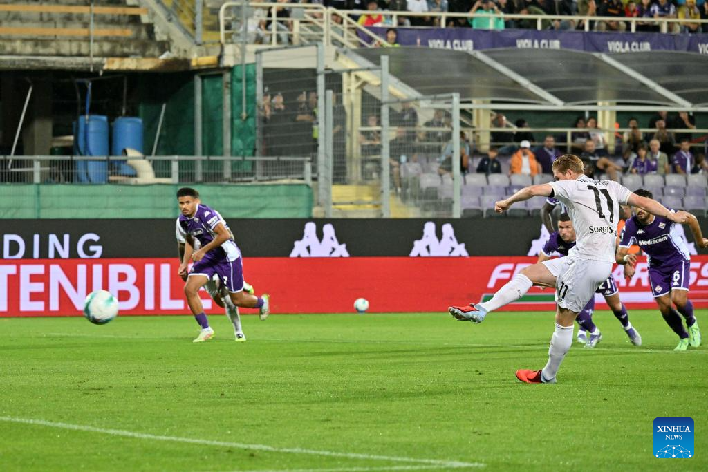 Napoli's Rasmus Hojlund (L) shoots and scores during a Serie A football match between Fiorentina and Napoli in Florence, Italy, Sept. 13, 2025. (Photo by Augusto Casasoli/Xinhua)