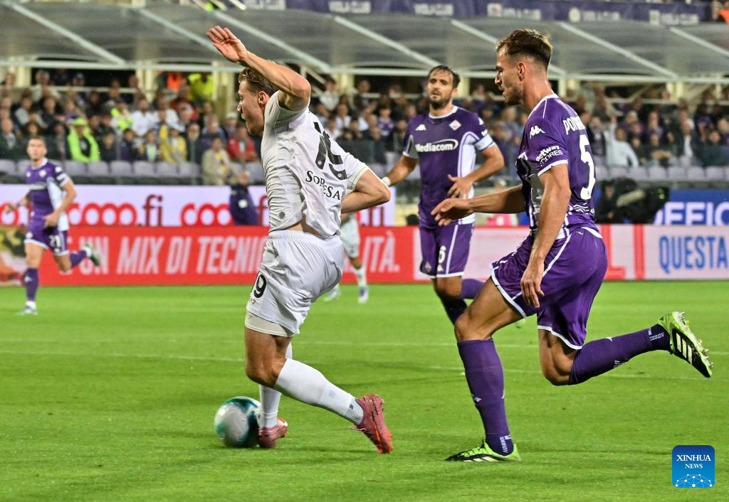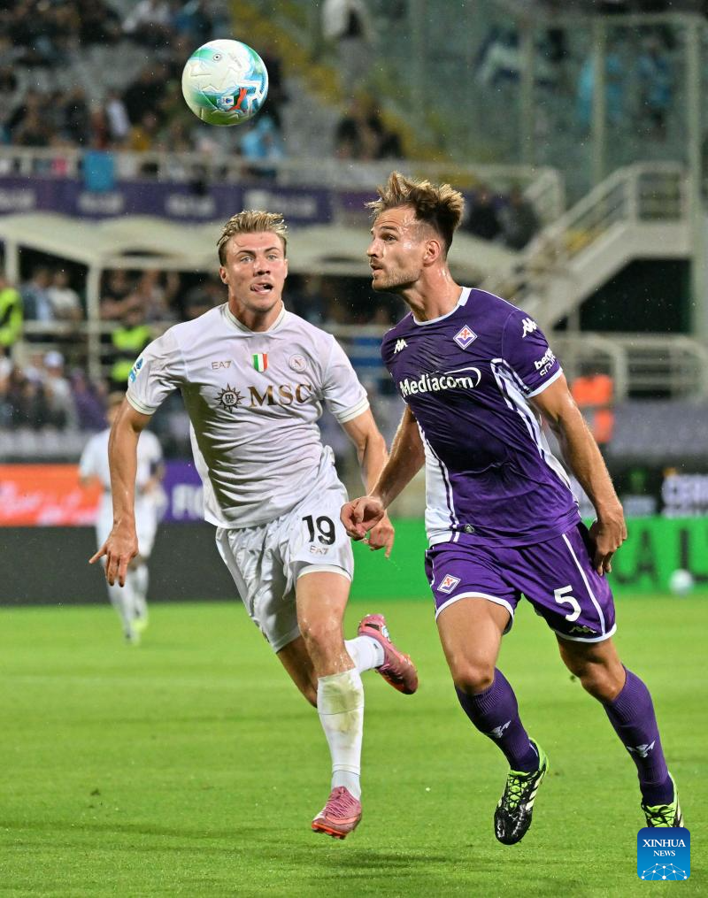Napoli's Rasmus Hojlund (L) vies with Fiorentina's Marin Pongracic during a Serie A football match between Fiorentina and Napoli in Florence, Italy, Sept. 13, 2025. (Photo by Augusto Casasoli/Xinhua)