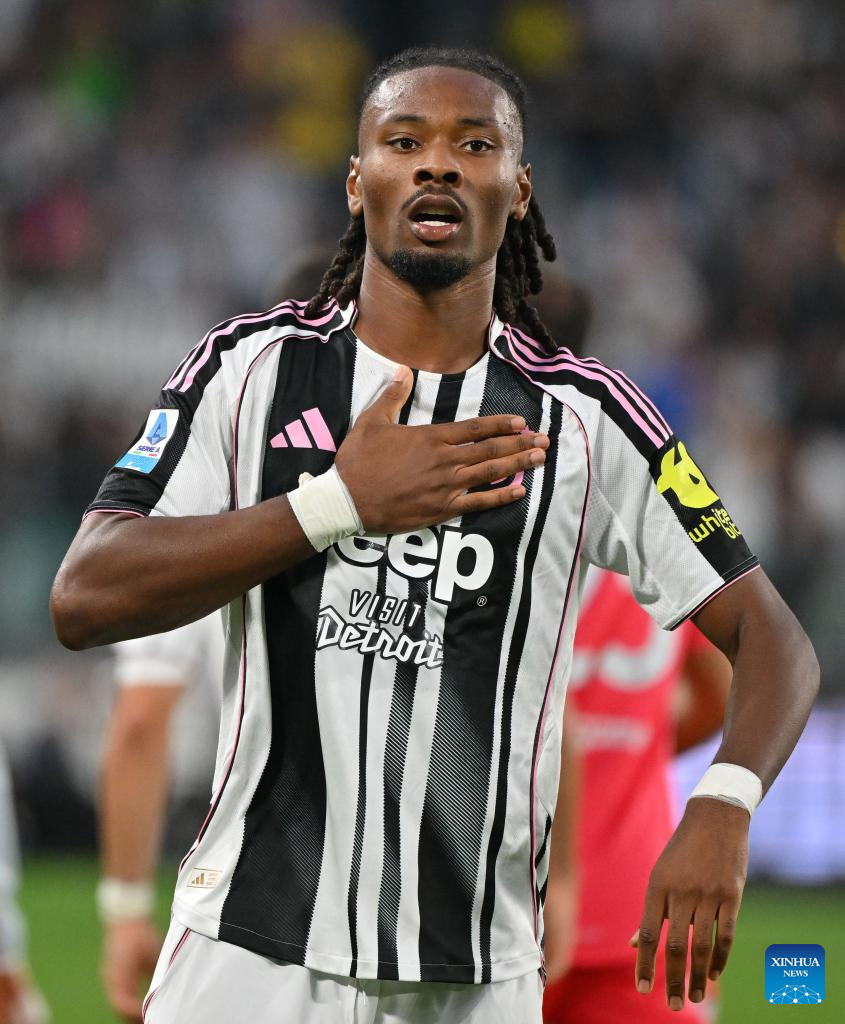 Juventus' Khephren Thuram celebrates his goal during a Serie A soccer match between Juventus and Inter Milan in Turin, Italy, Sept. 13, 2025. (Xinhua)