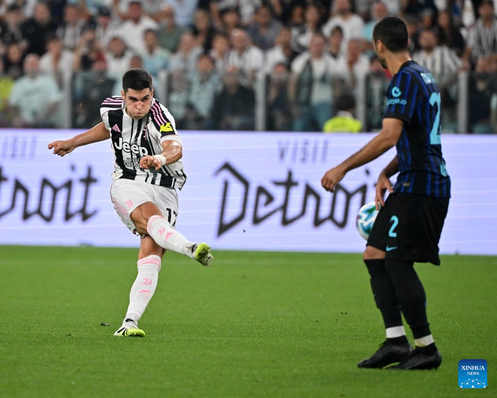 Juventus' Vasilije Adzic (L) scores during a Serie A soccer match between Juventus and Inter Milan in Turin, Italy, Sept. 13, 2025. (Xinhua)