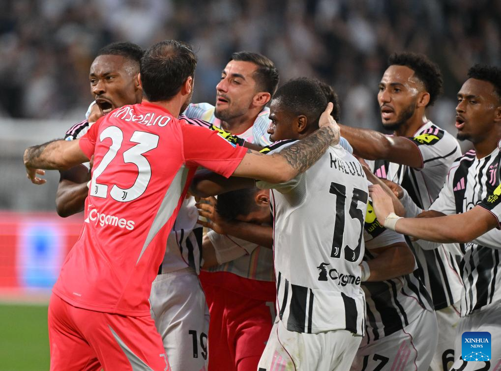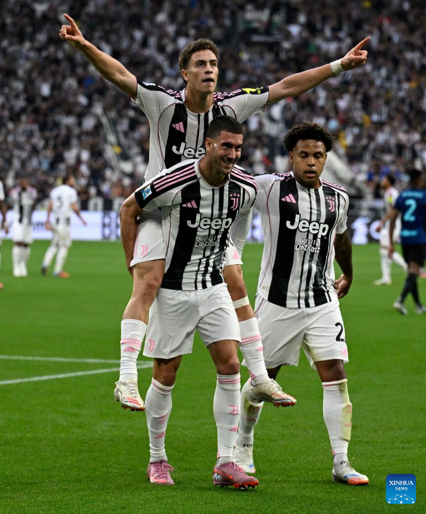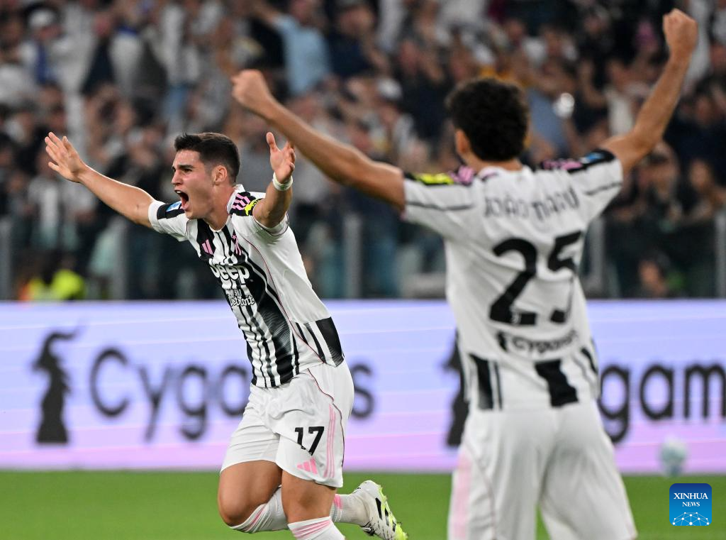Juventus' Vasilije Azdic (L) celebrates his goal during a Serie A soccer match between Juventus and Inter Milan in Turin, Italy, Sept. 13, 2025. (Xinhua)