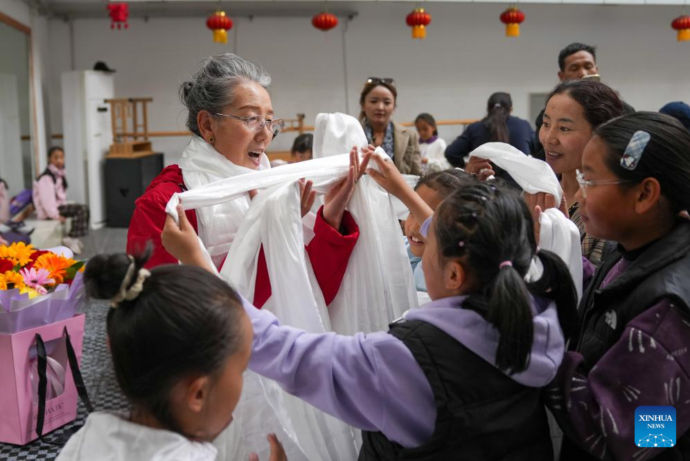 Children present hada to their teacher Pasang to express their belated Teachers' Day wishes at the public art center in Lhasa, southwest China's Xizang Autonomous Region, Sept. 14, 2025. Pasang, a national first-class performer and retired member of the Tibetan opera troupe of the Xizang Autonomous Region, has voluntarily devoted her weekends to teaching Tibetan opera to children for a decade.