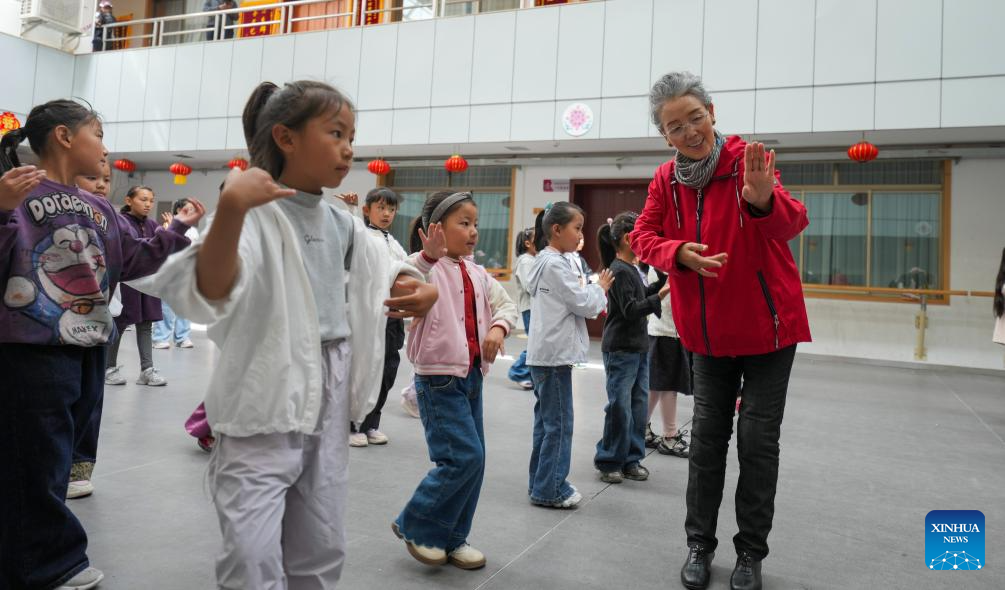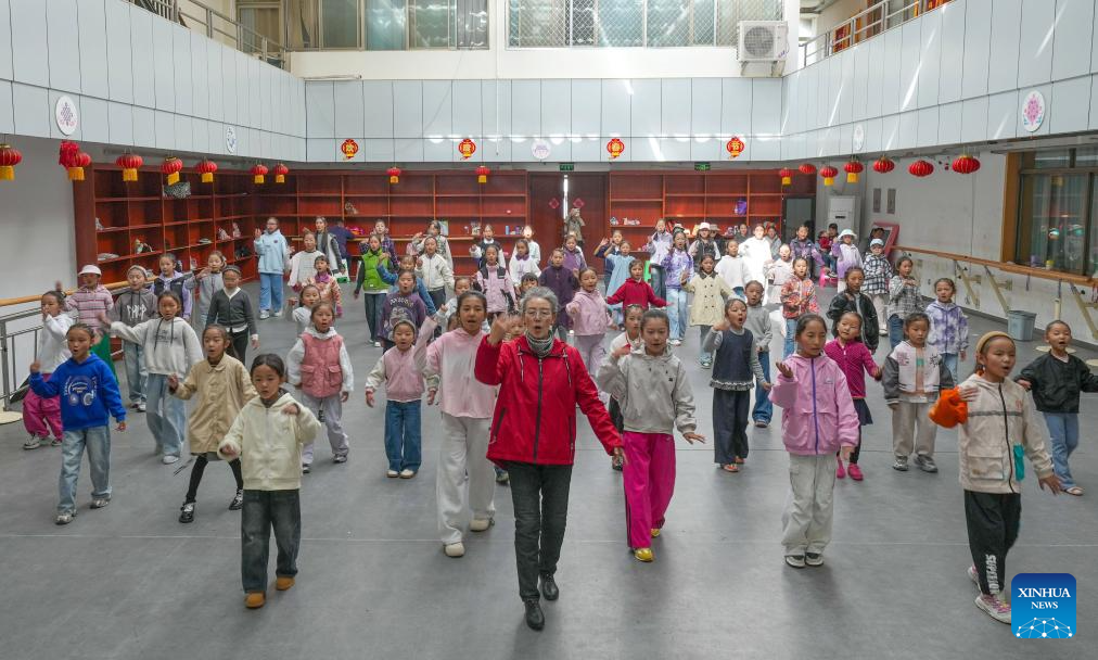 Pasang teaches children Tibetan opera at the public art center in Lhasa, southwest China's Xizang Autonomous Region, Sept. 14, 2025. Pasang, a national first-class performer and retired member of the Tibetan opera troupe of the Xizang Autonomous Region, has voluntarily devoted her weekends to teaching Tibetan opera to children for a decade.