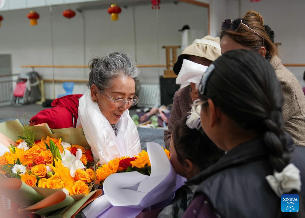 Children present flowers to their teacher Pasang to express their belated Teachers' Day wishes at the public art center in Lhasa, southwest China's Xizang Autonomous Region, Sept. 14, 2025. Pasang, a national first-class performer and retired member of the Tibetan opera troupe of the Xizang Autonomous Region, has voluntarily devoted her weekends to teaching Tibetan opera to children for a decade.
