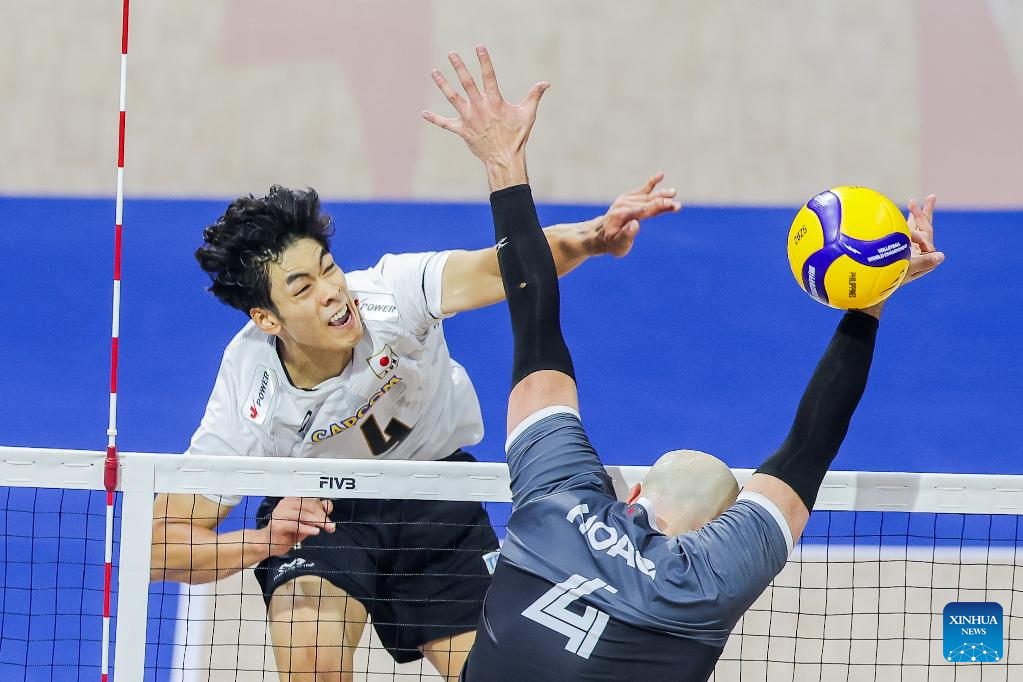 Miyaura Kento (L) of Japan competes against Nicholas Hoag of Canada during the pool G match between Canada and Japan at the FIVB Men's World Championship 2025 in Quezon City, the Philippines, on Sep. 15, 2025. (Xinhua/Rouelle Umali)