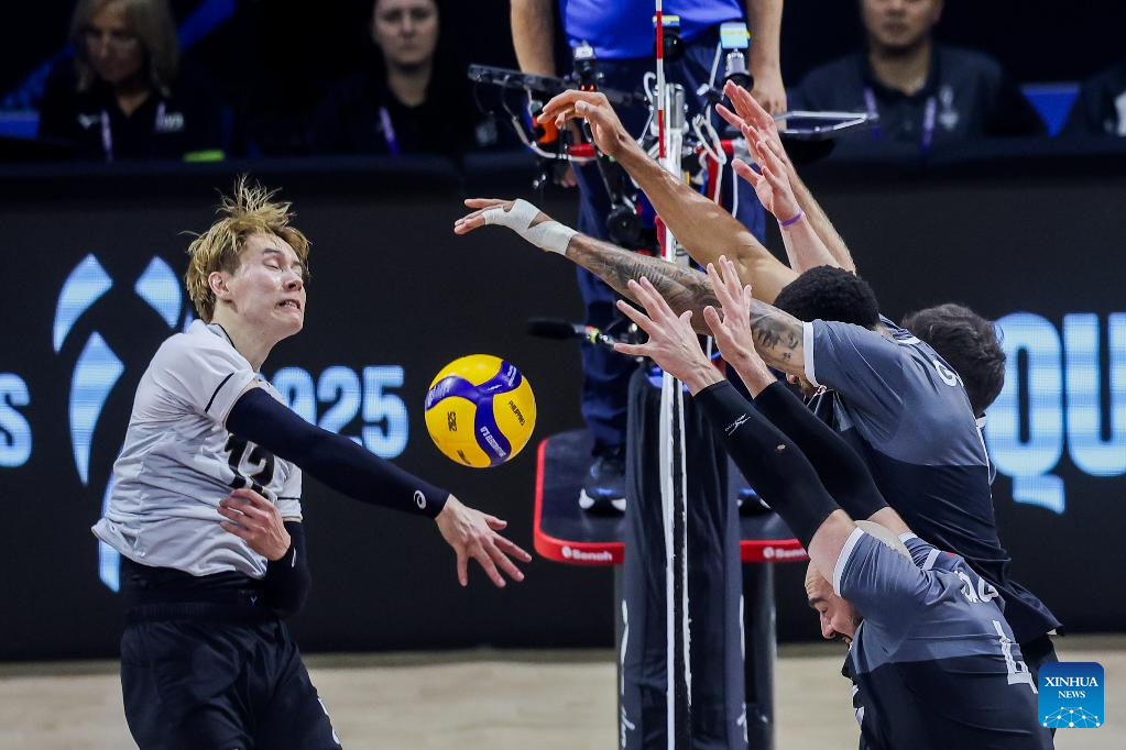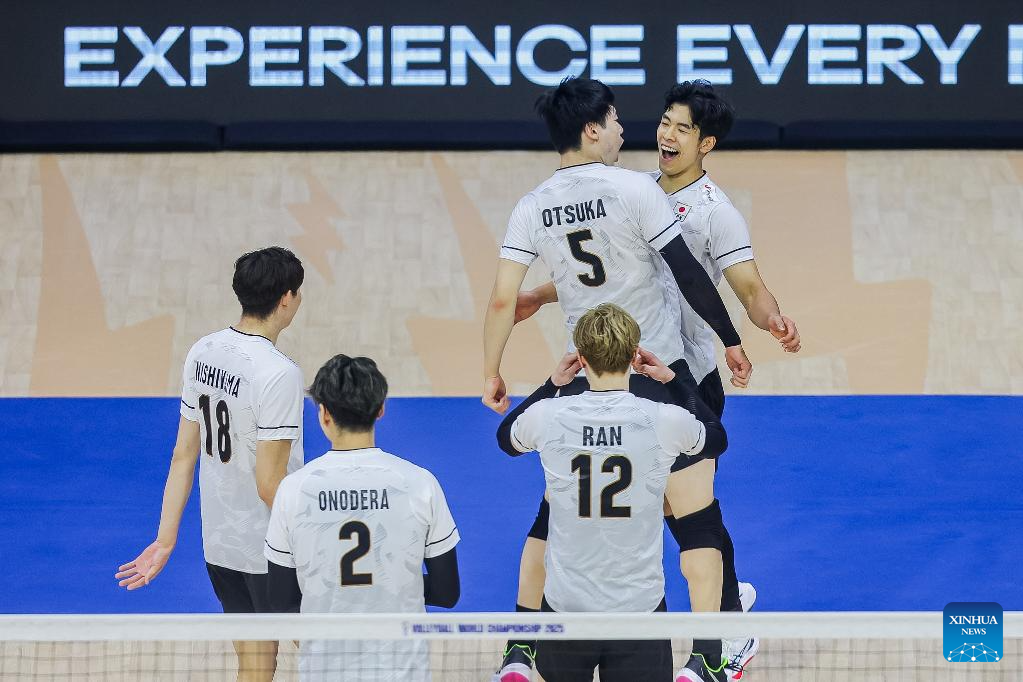 Players of Japan celebrate after scoring a point during the pool G match between Canada and Japan at the FIVB Men's World Championship 2025 in Quezon City, the Philippines, on Sept. 15, 2025. (Xinhua/Rouelle Umali)