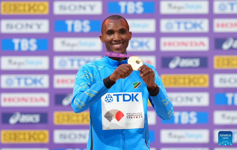 Gold medalist Alphonce Felix Simbu of Tanzania poses during the men's marathon awarding ceremony at the 2025 World Athletics Championships in Tokyo, Japan, Sept. 15, 2025. (Xinhua/Ju Huanzong)