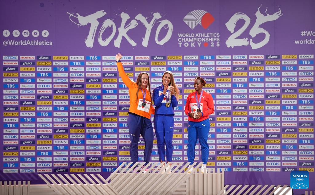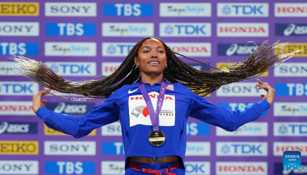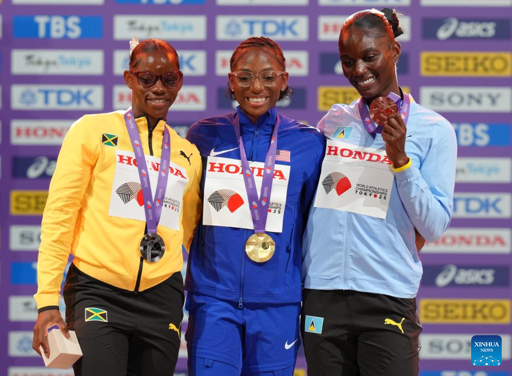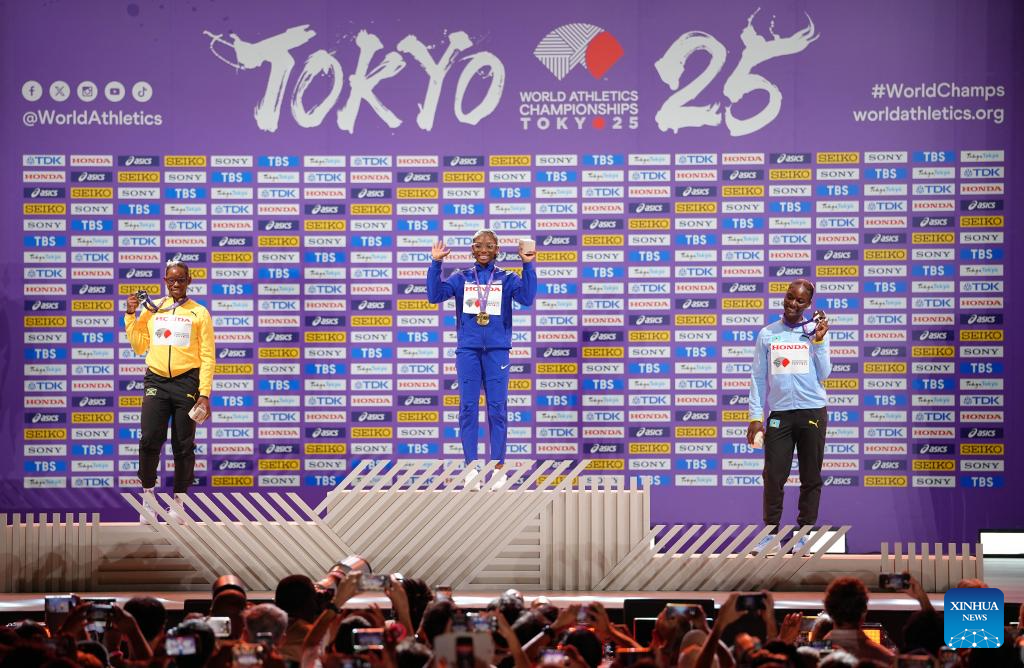 Gold medalist Tara Davis-Woodhall (C) of the United States is seen during the women's long jump awarding ceremony at the 2025 World Athletics Championships in Tokyo, Japan, Sept. 15, 2025. (Xinhua/Ju Huanzong)