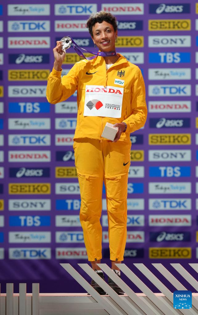 Silver medalist Malaika Mihambo of Germany poses during the women's long jump awarding ceremony at the 2025 World Athletics Championships in Tokyo, Japan, Sept. 15, 2025. (Xinhua/Ju Huanzong)