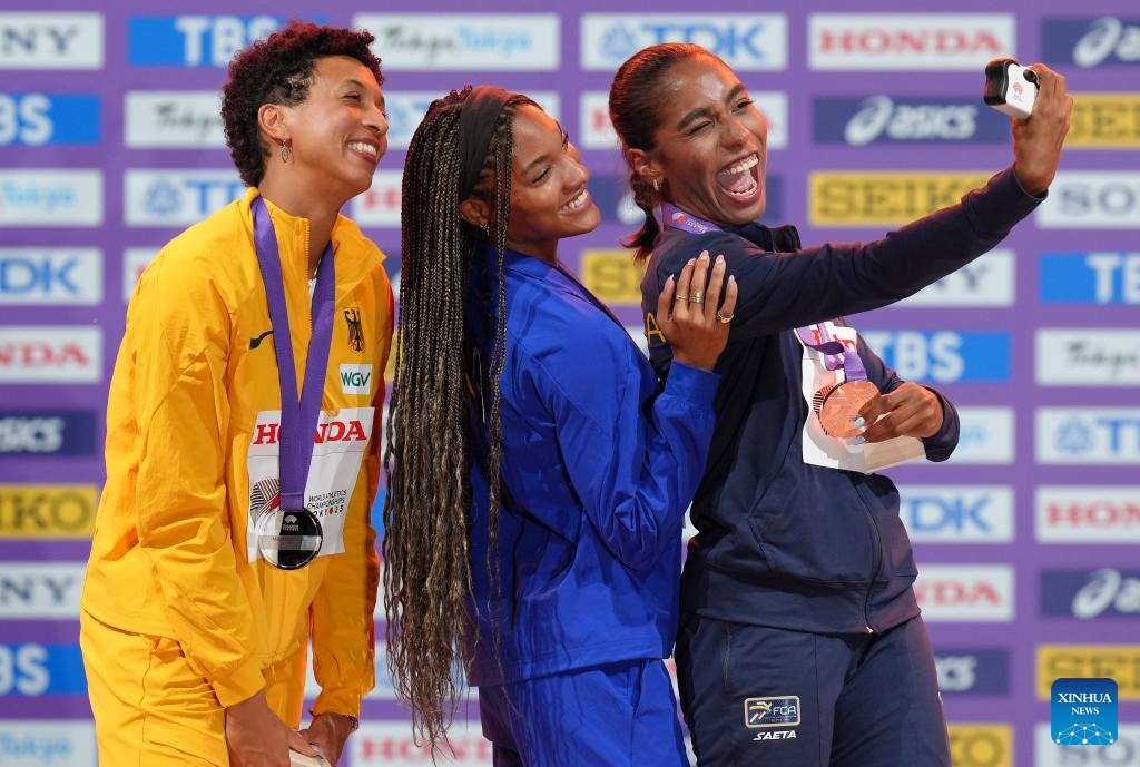 Gold medalist Tara Davis-Woodhall (C) of the United States, silver medalist Malaika Mihambo (L) of Germany and bronze medalist Natalia Linares of Colombia take a selfie during the women's long jump awarding ceremony at the 2025 World Athletics Championships in Tokyo, Japan, Sept. 15, 2025. (Xinhua/Ju Huanzong)