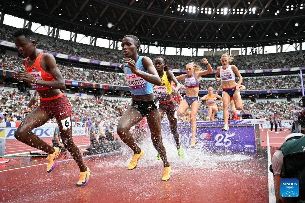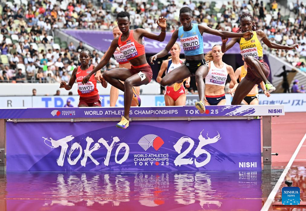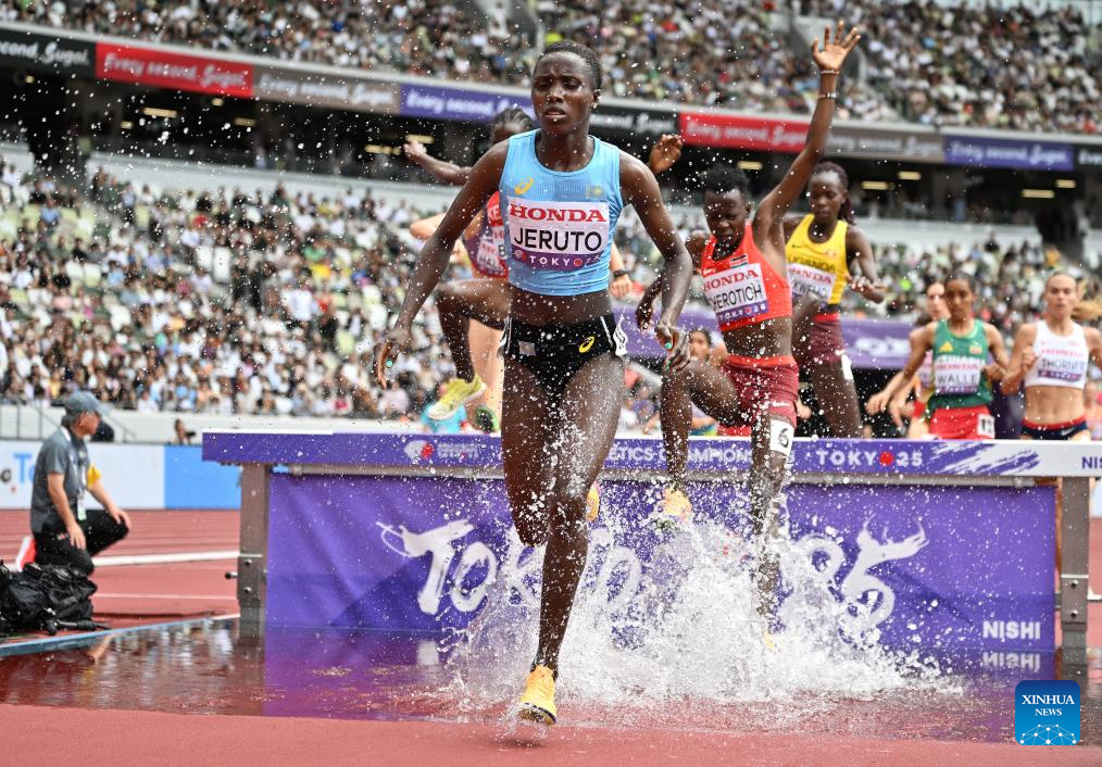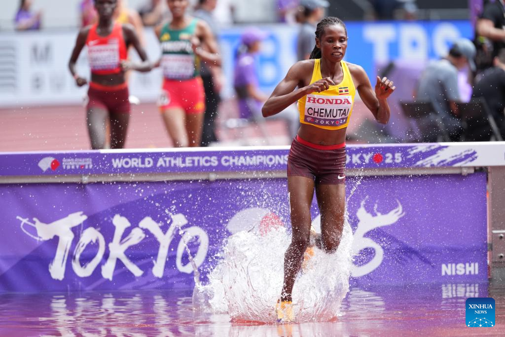 Peruth Chemutai of Uganda competes during the women's 3000m steeplechase heat at the 2025 World Athletics Championships in Tokyo, Japan, Sept. 15, 2025. (Xinhua/Jiang Han)