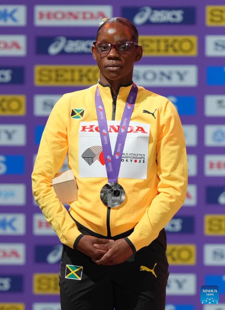 Silver medalist Tina Clayton of Jamaica is seen during the women's 100m awarding ceremony at the 2025 World Athletics Championships in Tokyo, Japan, Sept. 15, 2025. (Xinhua/Ju Huanzong)