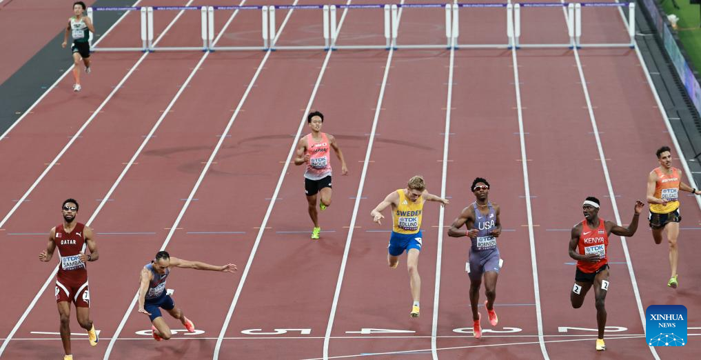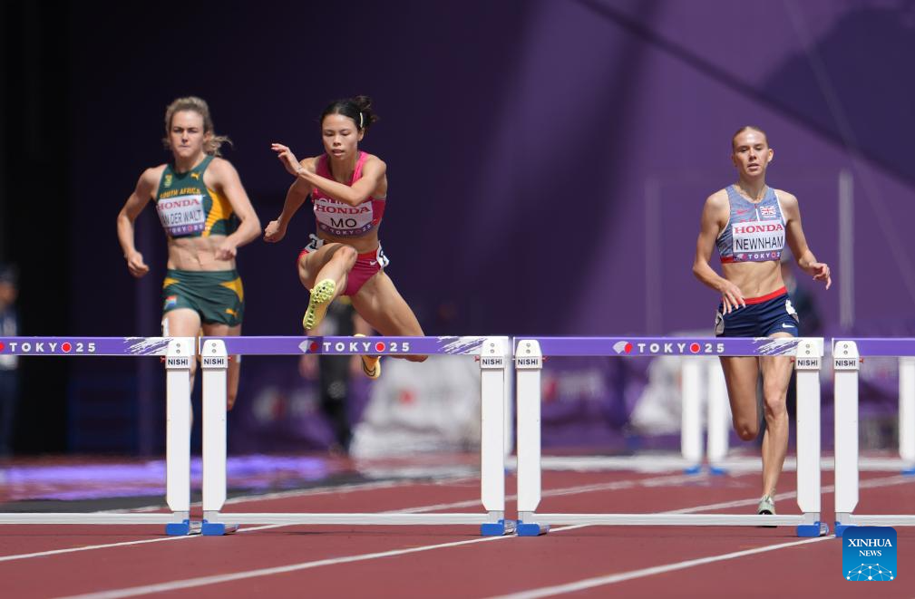 Mo Jiadie (C) of China competes during the women's 400m hurdles heat at the 2025 World Athletics Championships in Tokyo, Japan, Sept. 15, 2025. (Xinhua/Li Gang)