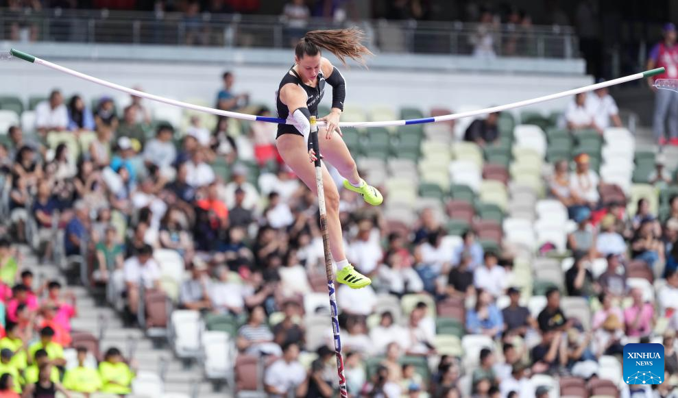 Olivia Mctaggart of New Zealand competes during the women's pole vault qualification at the 2025 World Athletics Championships in Tokyo, Japan, Sept. 15, 2025. (Xinhua/Jiang Han)