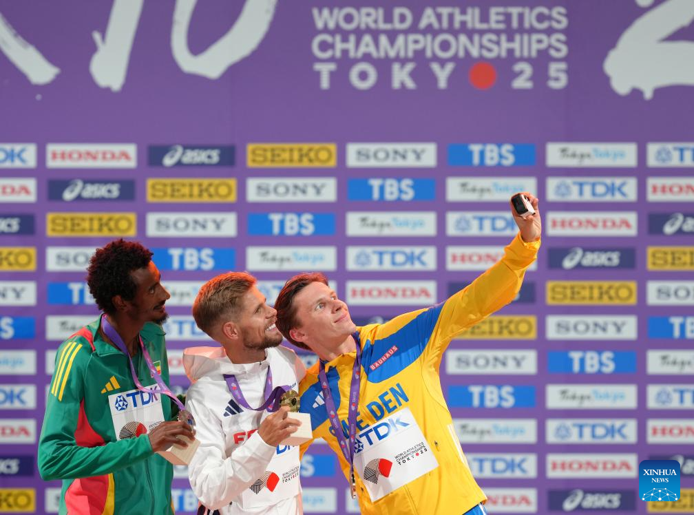 Gold medalist Jimmy Gressier (C) of France, silver medalist Yomif Kejelcha (L) of Ethiopia and bronze medalist Andreas Almgren of Sweden pose for a selfie during the men's 10000m awarding ceremony at the 2025 World Athletics Championships in Tokyo, Japan, Sept. 15, 2025. (Xinhua/Ju Huanzong)