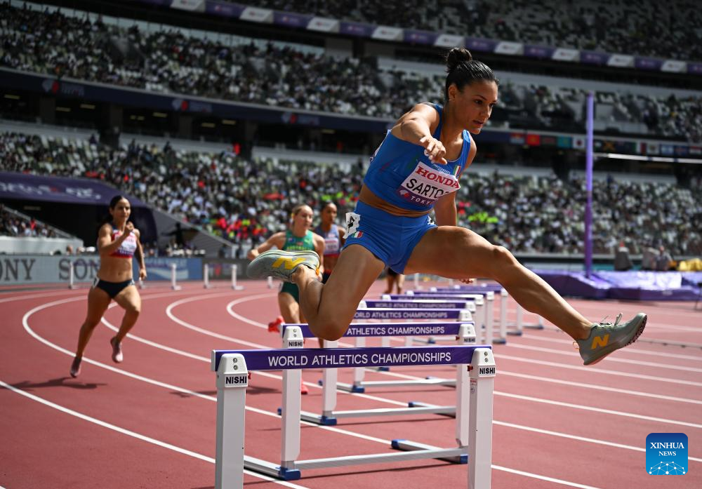 Rebecca Sartori (front) of Italy competes during the women's 400m hurdles heat at the 2025 World Athletics Championships in Tokyo, Japan, Sept. 15, 2025. (Xinhua/Jiang Han)