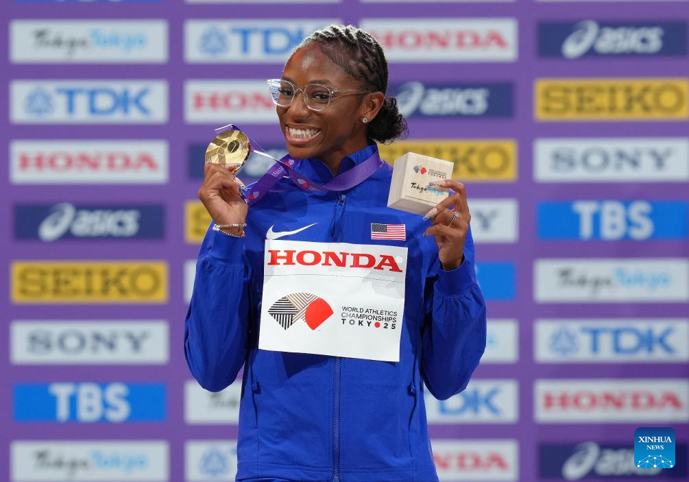 Gold medalist Melissa Jefferson-Wooden of the United States poses during the women's 100m awarding ceremony at the 2025 World Athletics Championships in Tokyo, Japan, Sept. 15, 2025.0 (Xinhua/Ju Huanzong)