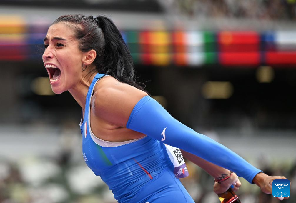 Roberta Bruni of Italy reacts during the women's pole vault qualification at the 2025 World Athletics Championships in Tokyo, Japan, Sept. 15, 2025. (Xinhua/Song Yanhua)