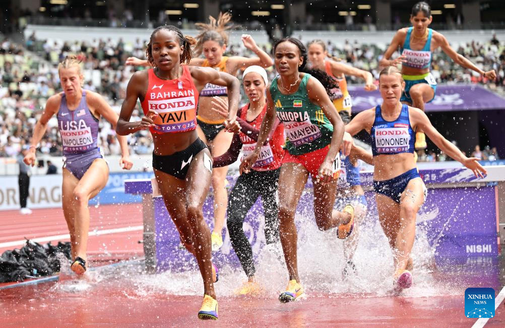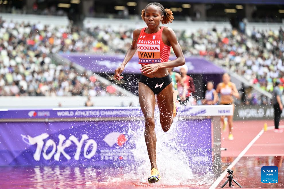 Winfred Yavi of Bahrain competes during the women's 3000m steeplechase heat at the 2025 World Athletics Championships in Tokyo, Japan, Sept. 15, 2025. (Xinhua/Song Yanhua)