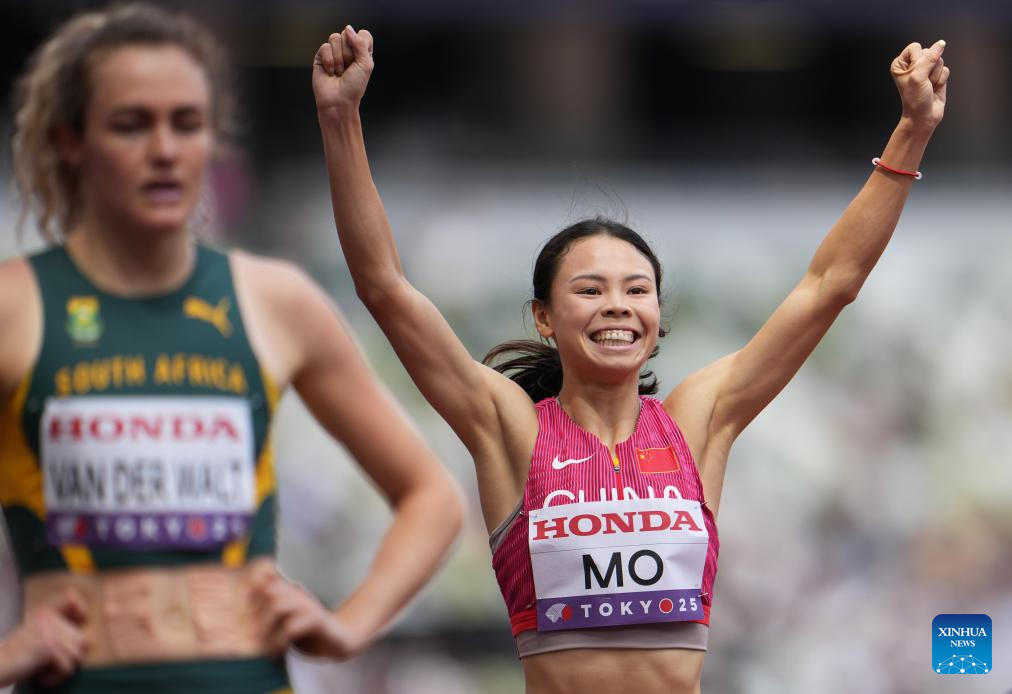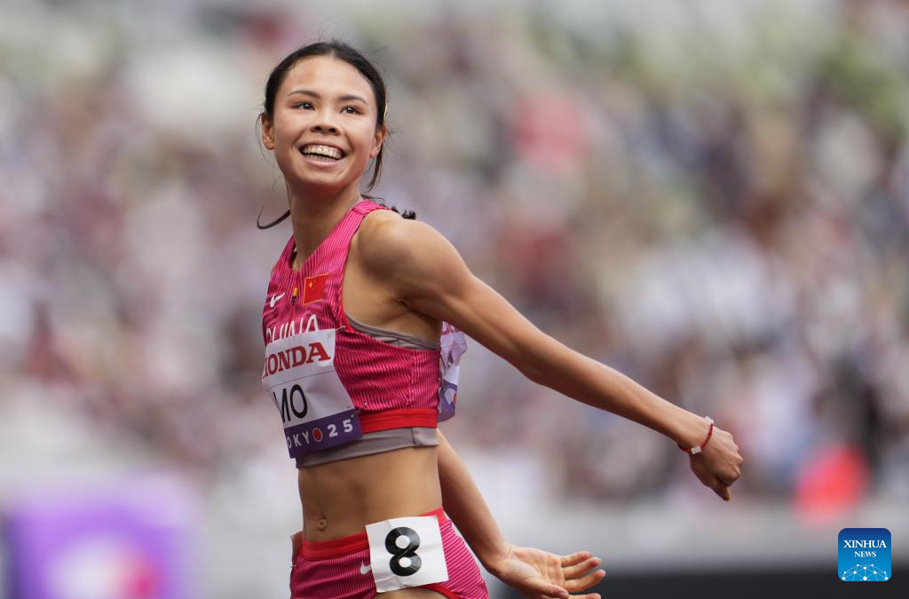Mo Jiadie of China celebrates after the women's 400m hurdles heat at the 2025 World Athletics Championships in Tokyo, Japan, Sept. 15, 2025. (Xinhua/Li Gang)