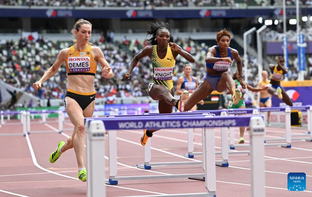 Andrenette Knight (C) of Jamaica competes during the women's 400m hurdles heat at the 2025 World Athletics Championships in Tokyo, Japan, Sept. 15, 2025. (Xinhua/Song Yanhua)