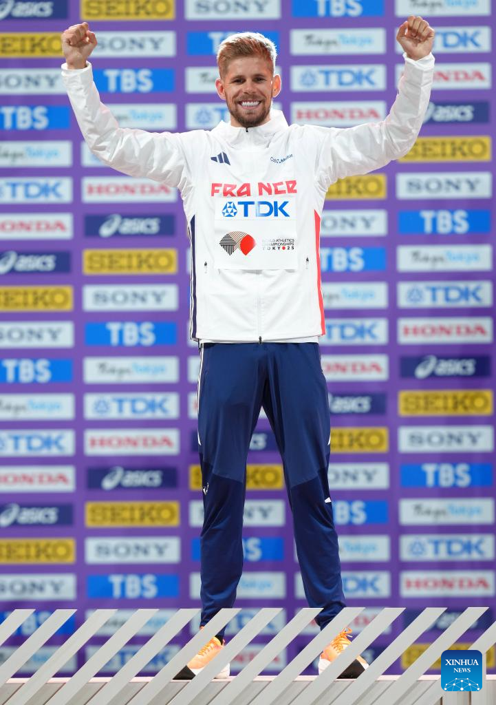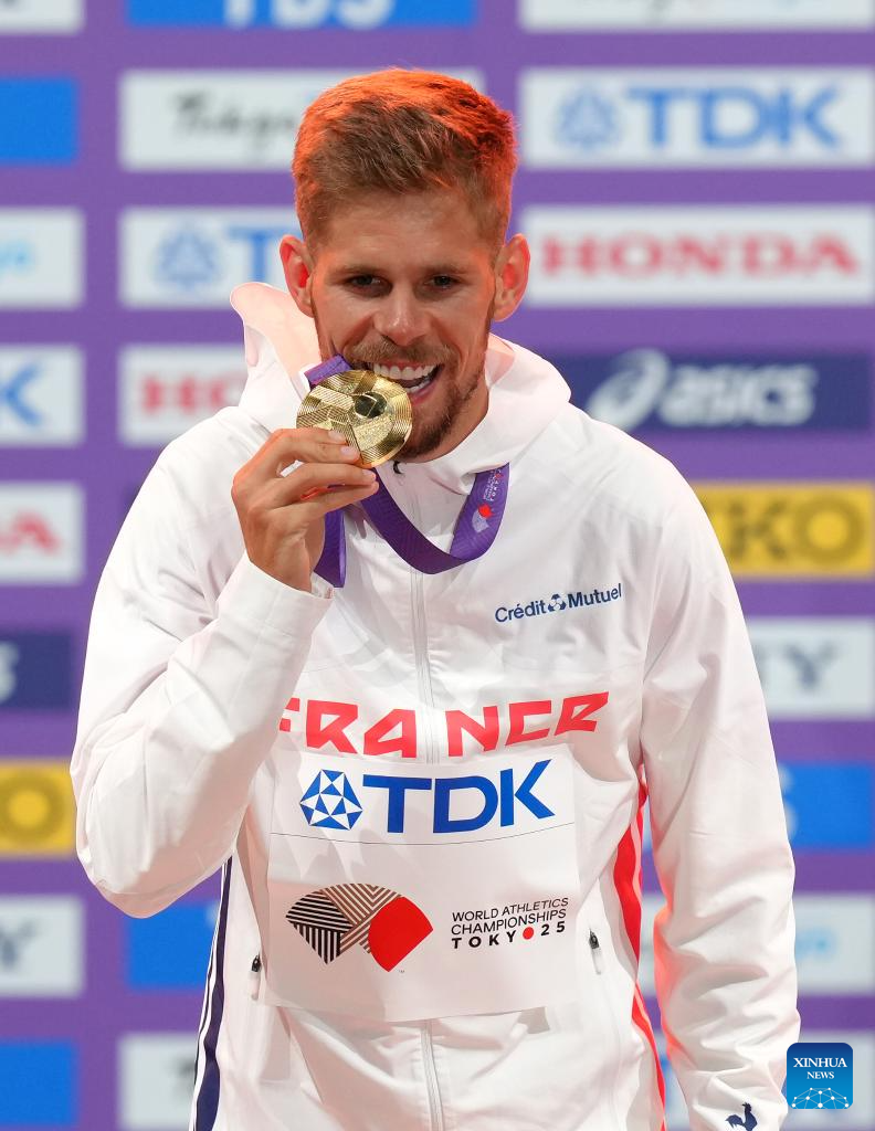 Gold medalist Jimmy Gressier of France poses during the men's 10000m awarding ceremony at the 2025 World Athletics Championships in Tokyo, Japan, Sept. 15, 2025. (Xinhua/Ju Huanzong)