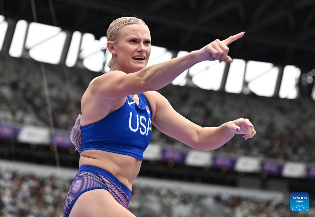 Katie Moon of the United States reacts during the women's pole vault qualification at the 2025 World Athletics Championships in Tokyo, Japan, Sept. 15, 2025. (Xinhua/Song Yanhua)